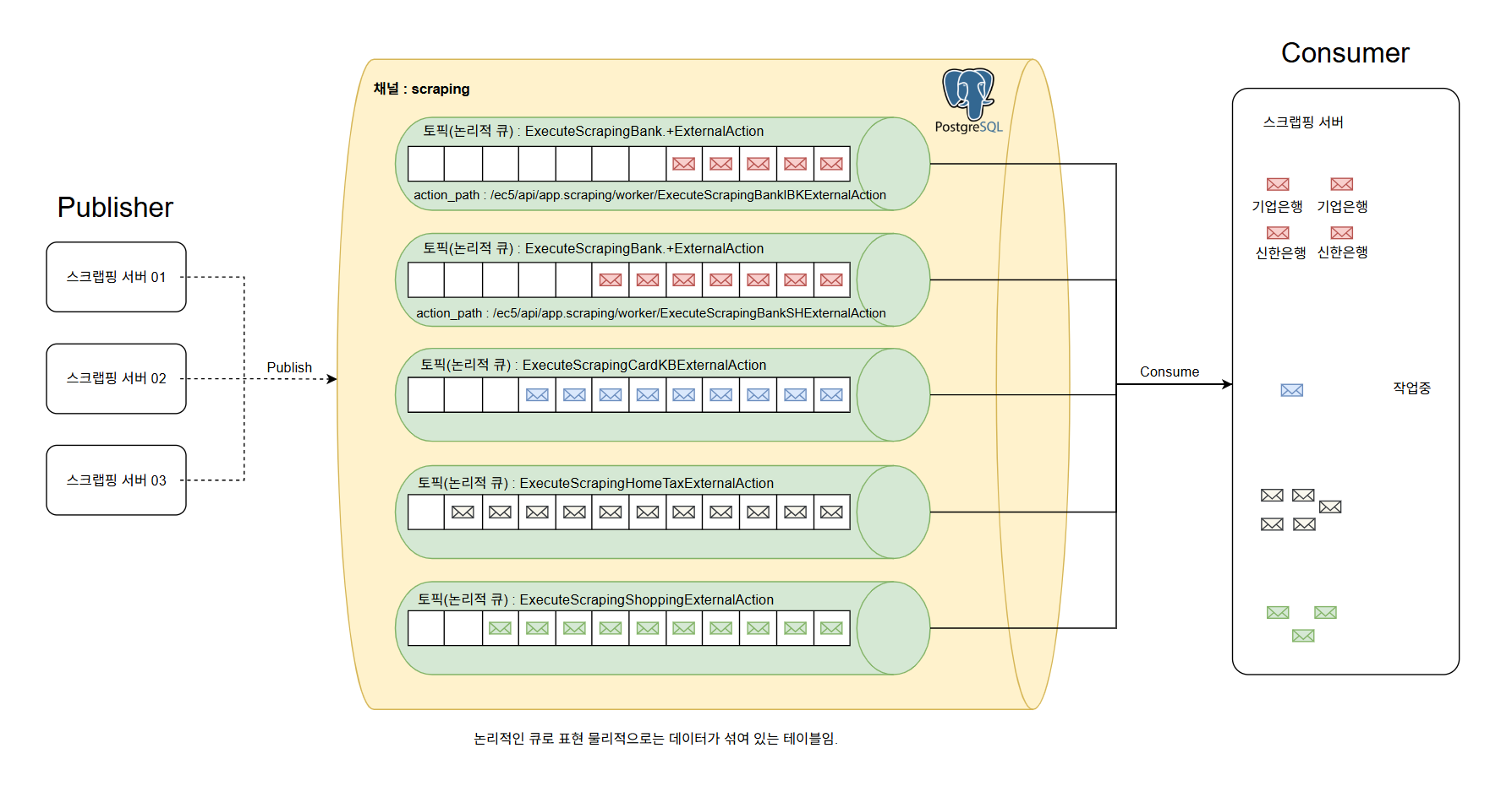 PGMQ๋ ํ ํฝ(Queue)๋ณ๋ก ์ ์ฅ๋ ๋ฉ์์ง row๋ฅผ ์ง์ SELECT ํ์ฌ ๊ฐ์ ธ์ค๋ ๋ฐฉ์์ผ๋ก ๋์ํฉ๋๋ค.