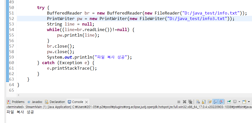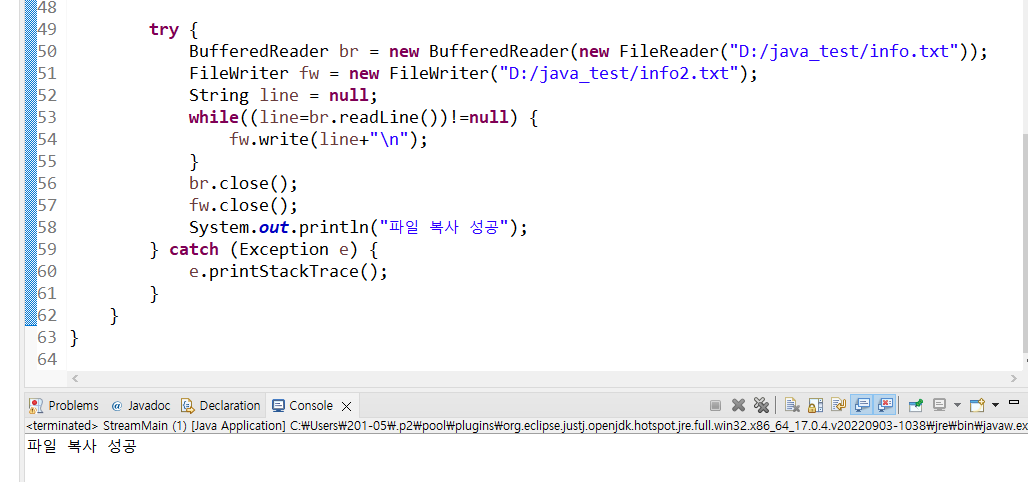 ์๋ฐ๊ฐ ์ด์์ฒด์ ๋ฐ๋ผ์ ์์์ ๊ฐํ๋ฌธ์๋ฅผ ์ฐ๊ฒ๋ํ๋ ํํฐ ์คํธ๋ฆผ์ ๋ฃ์ด์ค ํ์ผ ๋ณต์ฌํ๊ธฐ