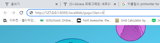 Server.xml์์ ์ค์ ํด๋ ํฌํธ ๋ฒํธ์ ํ๋ก์ ํธ๋ช ("JavaWeb")๊ณผ @WebServlet("/gugu")๋ฅผ ์ฃผ์๋ก ์ ๋ ฅํ์ฌ ์นํ์ด์ง๋ฅผ ๋ค์ด๊ฐ ์ ์๋ค.
