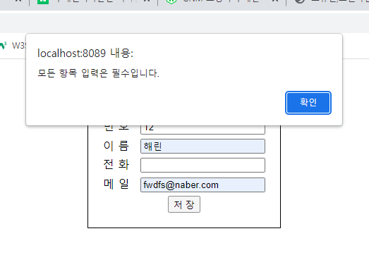 4๊ฐ์ง ์์ฑ์ค ๋น ๊ฐ์ด ์๋ค๋ฉด ๋ชจ๋ ํญ๋ชฉ์ ๋ค ์ ๋ ฅํ๋ผ๊ณ alert์ฐฝ์ ๋์ธ ์ ์๊ฒ ๋๋ค.
