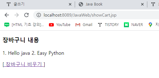 ์ฃผ์์ฐฝ์ showCart.jsp๋ฅผ ์ ๋ ฅํ๋ฉด ์์์ ์ ์ฅํ 2๊ฐ์ ๋ฌธ์์ด์ด ๋ชจ๋ ํ์ ๋๋๋ก ํ๋ค.