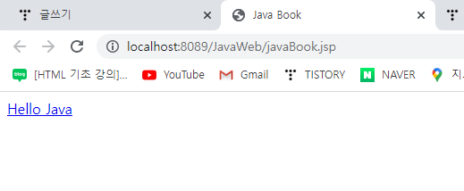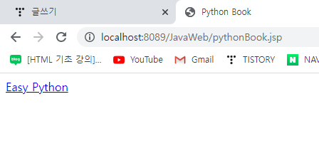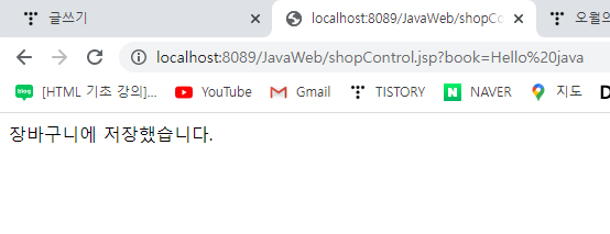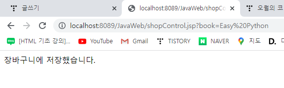 javaBook.jsp๊ฐ ํ๋ฉด์ ํ์๋์ด ์์๋ 'Hello Java'๋ฅผ ํด๋ฆญํ๋ฉด ์๋ฒ์ธก(shopControl.jsp)์ ๊ทธ ๋ฌธ์์ด์ด ์ ์ฅ๋๊ณ pythonBook.jsp๊ฐ ํ๋ฉด์ ํ์ ๋์ด ์์ ๋ 'Easy Python'์ ํด๋ฆญํ๋ฉด ์๋ฒ์ธก(shopControl.jsp)์ ๊ทธ ๋ฌธ์์ด์ด ์ ์ฅ๋๋๋กํ๋ค. ์์ 2๊ฐ ํ์ด์ง๋ฅผ ์ ์ํ ๋ ์น๋ธ๋ผ์ฐ์ ์ฃผ์์ฐฝ์ ์ด์ฉํ๋ผ