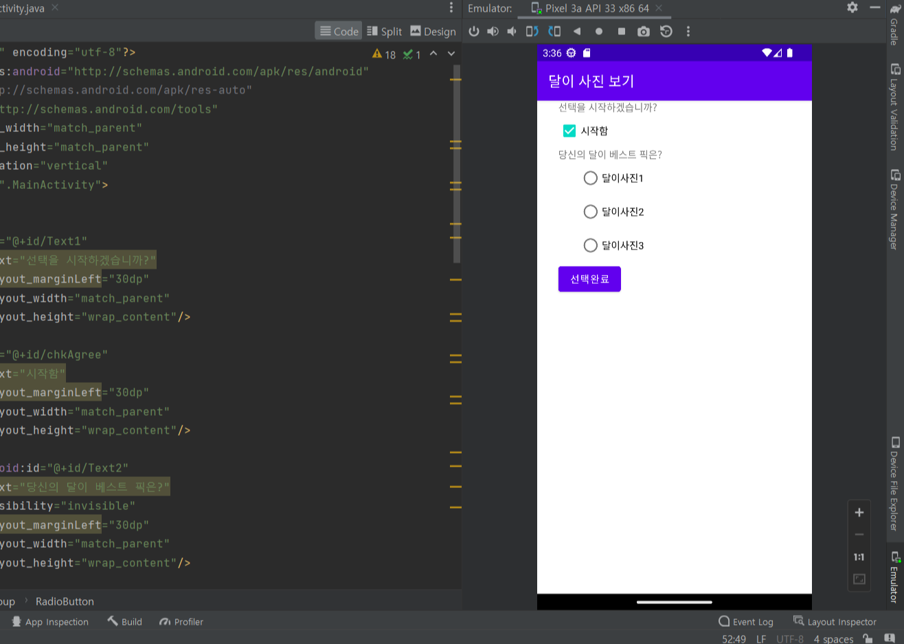 android:text="๋น์ ์ ๋ฌ์ด ๋ฒ ์คํธ ํฝ์?"
