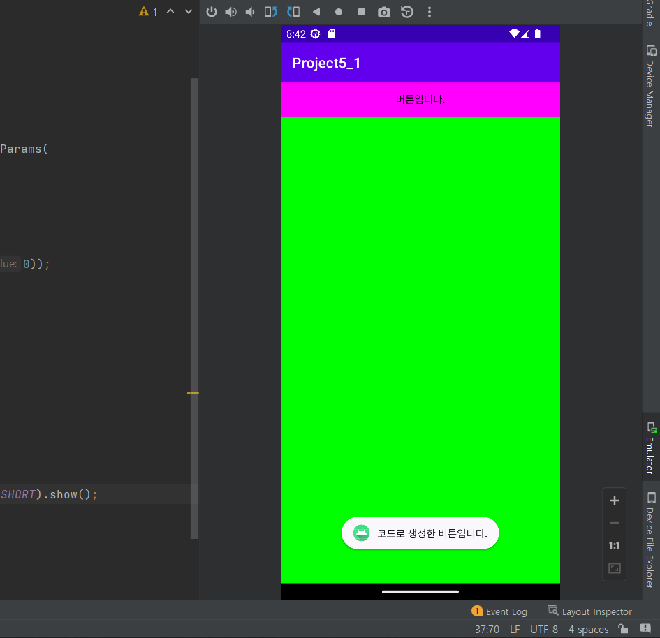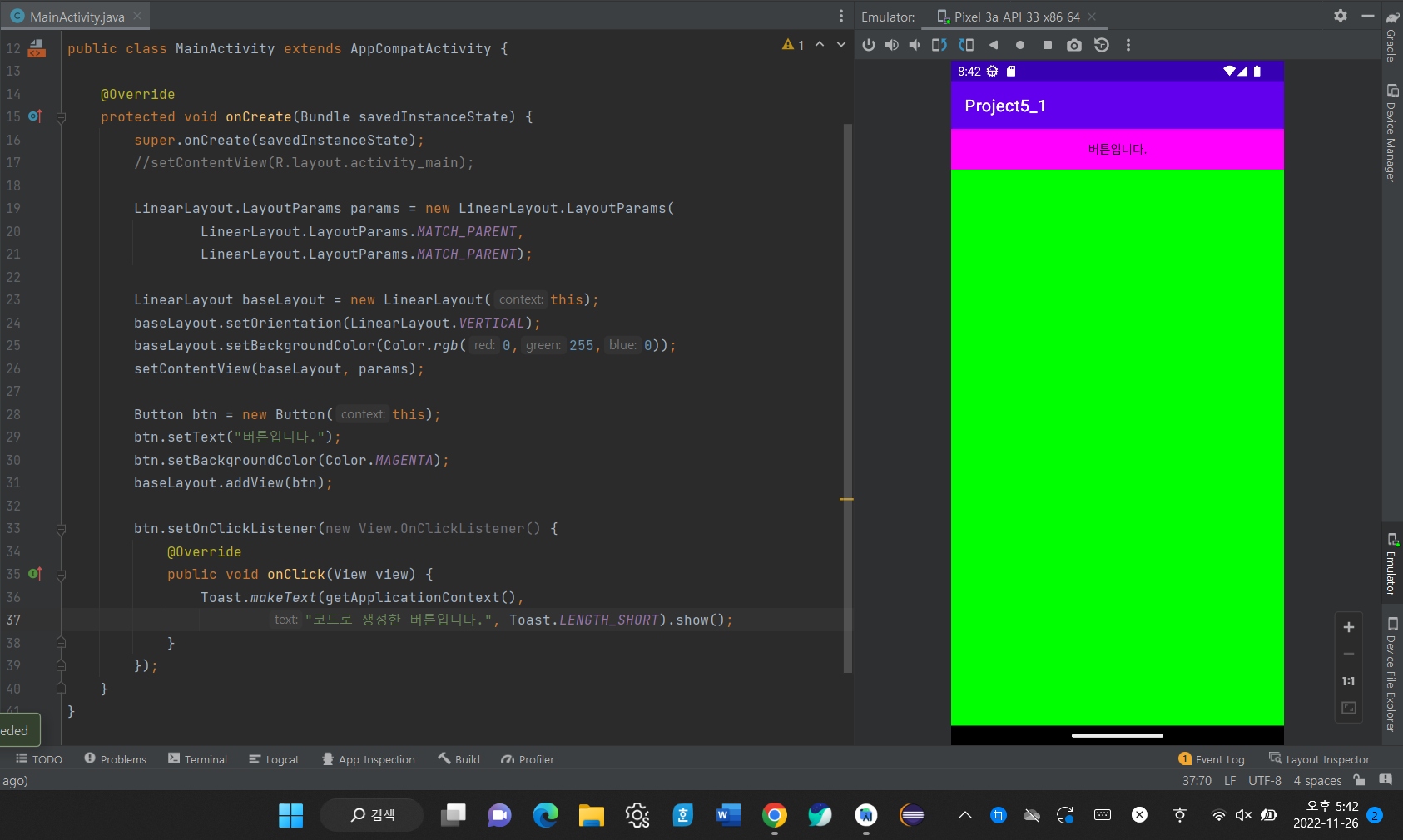 20 ν : μ€λΉλ λ²νΌμ λ μ΄μμμ μΆλ ₯νλ€. baseLayoutμ μμ μμ±ν 리λμ΄ λ μ΄μμμ΄λ€. νμνλ€λ©΄ addView() λ©μλμ μμ ― λ³μμ λ μ΄μμ νλΌλ―Έν°λ₯Ό λκΈΈ μλ μλ€. μ§κΈμ μμ ― λ³μλ§ λκΈ°κ³ λ μ΄μμμ μλ΅νλλ°, μ΄λ΄ κ²½μ° λν΄νΈλ‘ layout_widthλ match_parentκ° λκ³ layout_heightλ wrap_contentκ° λλ€.