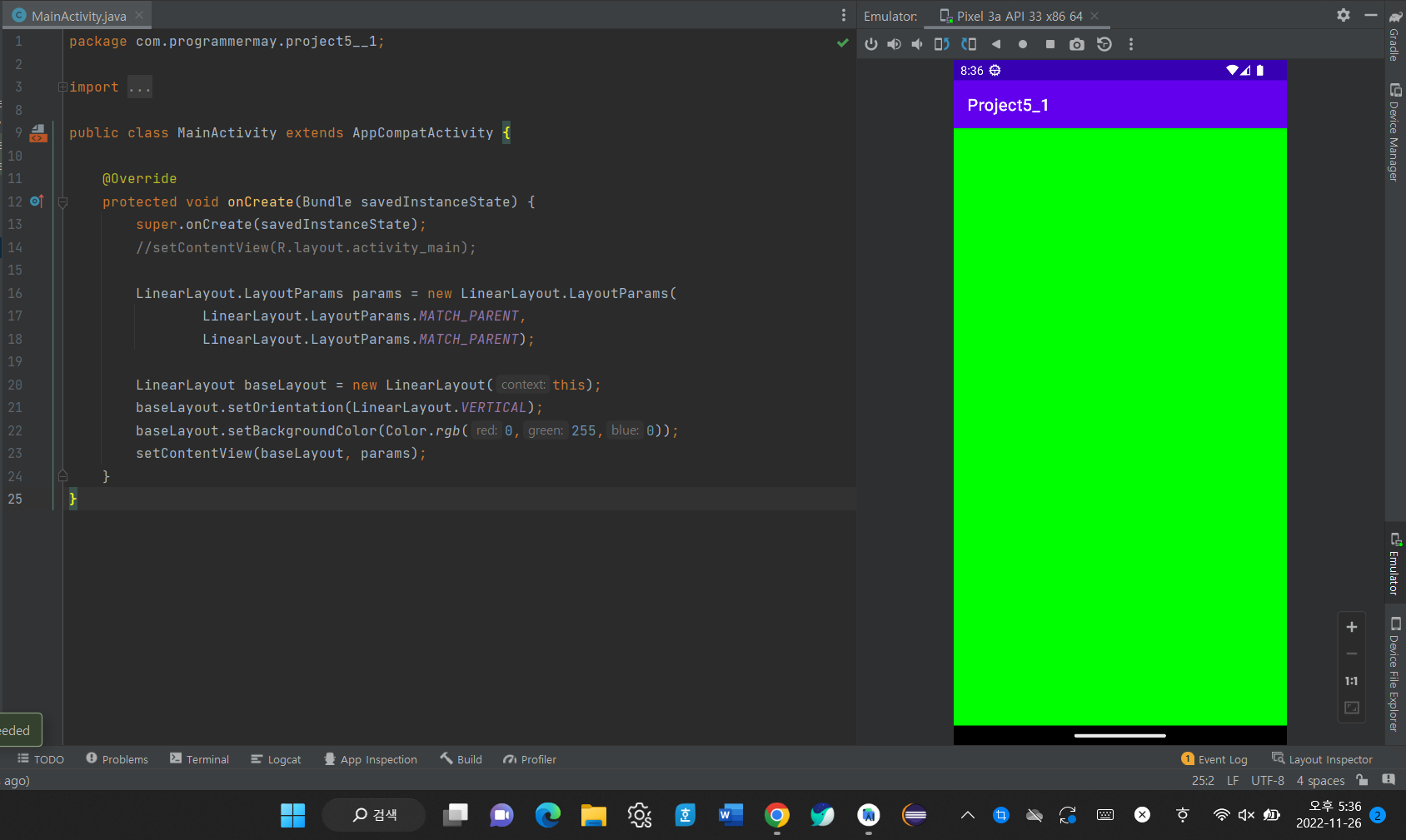 8 ~ 10ν : LinearLayoutParams λ³μλ₯Ό μ μΈνλ€. μμ±μμμ νλΌλ―Έν°λ layout_width, layout_height μ€ 2κ°λ₯Ό μ§μ ν μ μλ€. λ€μ XMLμ½λμ λμΌνλ€.