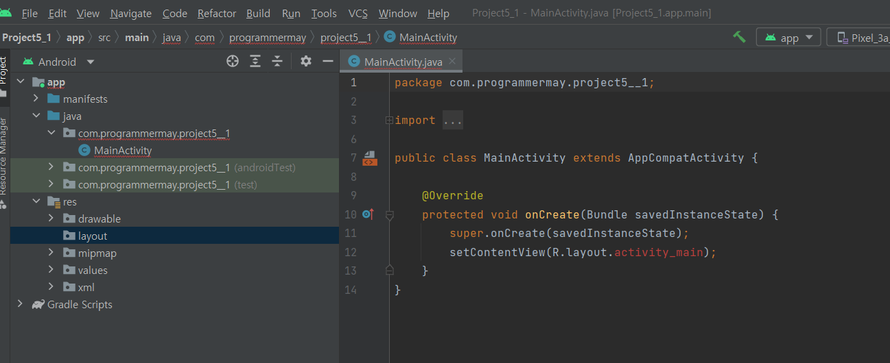 μ§κΈκΉμ§ μμ±ν νλ‘μ νΈλ κΈ°λ³Έμ μΌλ‘ activity_main.xmlμμ νλ©΄μ ꡬμ±ν ν Java νμΌ (MainActivity.java)μ setContentView() λ©μλλ‘ νλ©΄μ μΆλ ₯νλ€. λ©μΈ Javaμ½λμ setContentView() λ©μλλ xmlνμΌμ νλ©΄μ μΆλ ₯νλ κΈ°λ₯μ νλ€. μ¬κΈ°μ R.layout.activity_mainμ λ°λ‘ activity_main.xml νμΌμ μλ―Ένλ―λ‘, μ½λ©ν activity_main.xml νμΌμ΄ νλ©΄μ μΆλ ₯λλ κ²μ΄λ€.