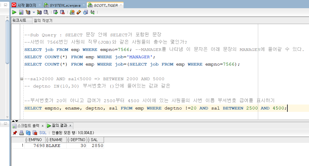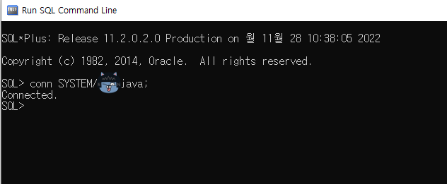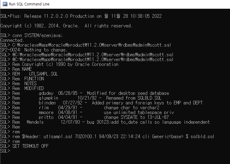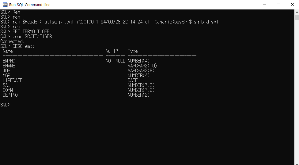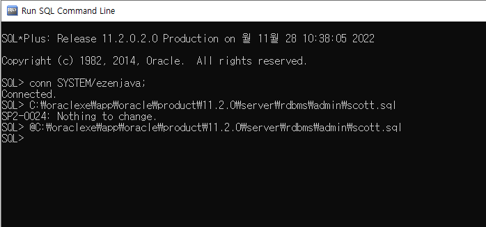 Run SQL Command Line์์ ํ์ต์ฉ ๊ณ์ (scott/TIGER) ํ์ฑํ