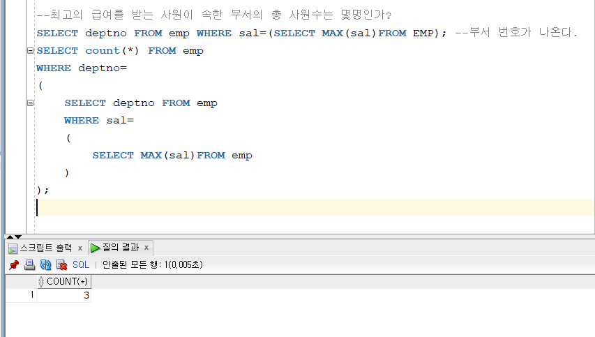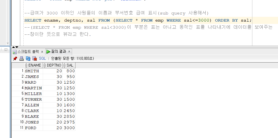 ๊ธ์ฌ๊ฐ 3000์ดํ์ธ ์ฌ์๋ค์ ์ด๋ฆ๊ณผ ๋ถ์๋ฒํธ ๊ธ์ฌ ํ์ (sub query๋ฅผ ๊ตณ์ด ์ฌ์ฉํด์) ๊ธ์ฌ ์์ผ๋ก ์ ๋ ฌํด์ ํ์