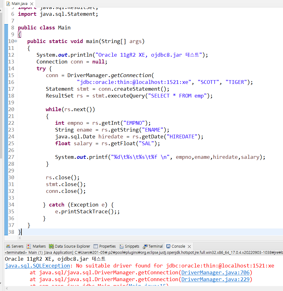 JDBC ๋๋ผ์ด๋ฒ๊ฐ ์ฐ๊ฒฐ๋์ง ์์ ์๋ฌ๊ฐ ๋ฌ๊ฑธ ๋ณผ ์ ์๋ค.