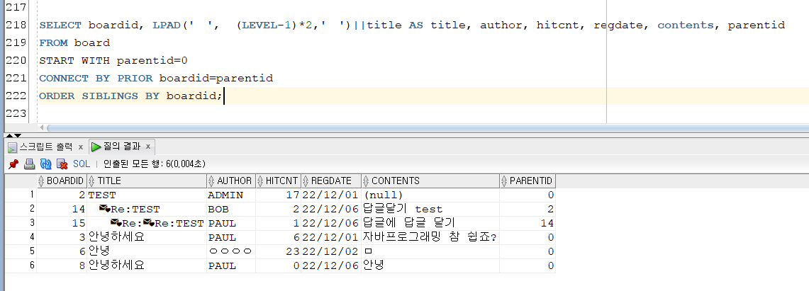 ์ ๋ก์ง์ ๊ธฐ์กด์ ์๋ ๋ฆฌ์คํธ๋ฅผ ๋ณด์ฌ์ฃผ๋ ๋ก์ง์์ ์ด์ ๊ณ์ธต๊ตฌ์กฐ๋ฅผ ์จ์ ๋ต๊ธ์ด boardid๊ฐ ์ฆ ๊ธ๋ฒํธ๊ฐ ๋ฆ์ด๋ ์๊ธ์ ๋ฐ๋ก ์๋ ๊ฐ๊ฒ ๋ ํด์ฃผ๊ธฐ ์ํ์ฌ ๋ฐ๊ฟ์ฃผ์๋ค. ํต์ฌ์ ์ธ ๋ก์ง์ด ์๋ SQL ์ฟผ๋ฆฌ๋ฅผ ๋ฐ๋ SQL developer์์ ๋ํ๋ด๋ฉด ๋ค์๊ณผ ๊ฐ๋ค.