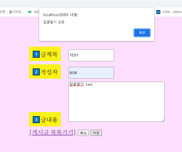 BoardService.java ์์ ๋์ด์จ response์ repleAdded๊ฐ true๋ฉด ๋ต๊ธ๋ฌ๊ธฐ ์ฑ๊ณต์ false๋ฉด ๋ต๊ธ๋ฌ๊ธฐ ์คํจ๋ฅผ alert์ฐฝ์ ๋์ด๋ค.