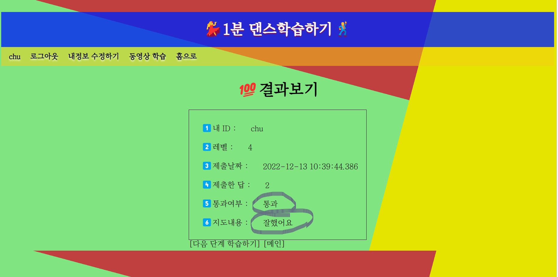 μ΄μ©μκ° λμμμ νμ΅νκ³ κ΄λ¦¬μκ° ν΅κ³Ό μ¬λΆλ₯Ό νλ¨νμ¬ ν΅κ³Ό νλ©΄ λ€μλ¨κ³ νμ΅μ μμν μ μλλ‘ νκΈ°