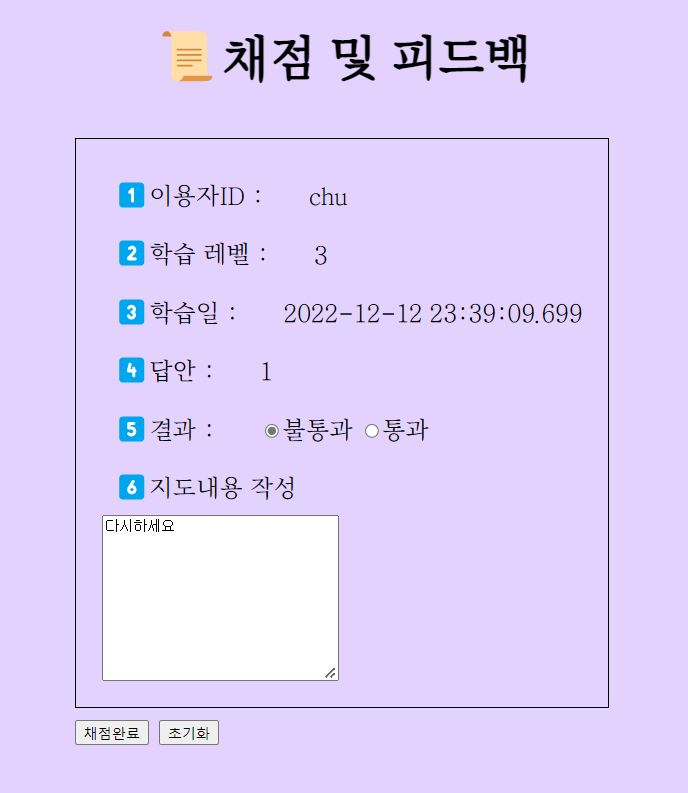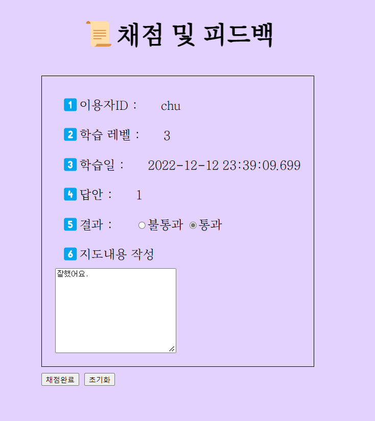 <label>4๏ธโฃ์ฑ์ ๊ฒฐ๊ณผ :</label>