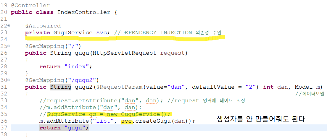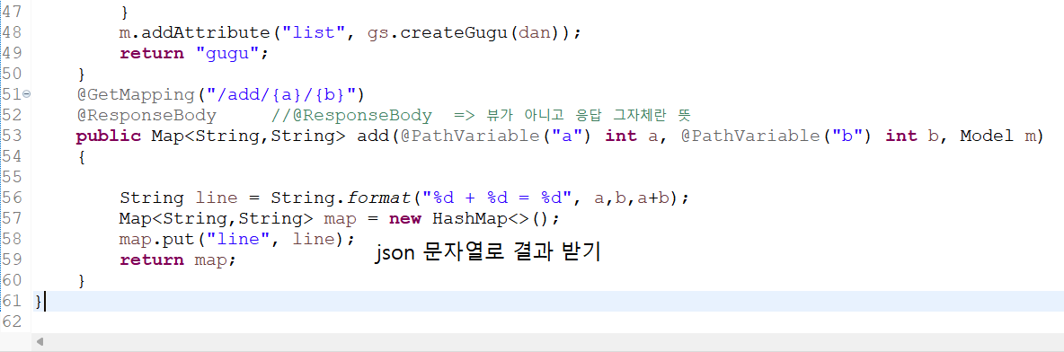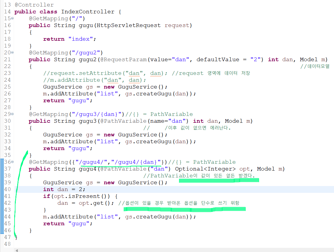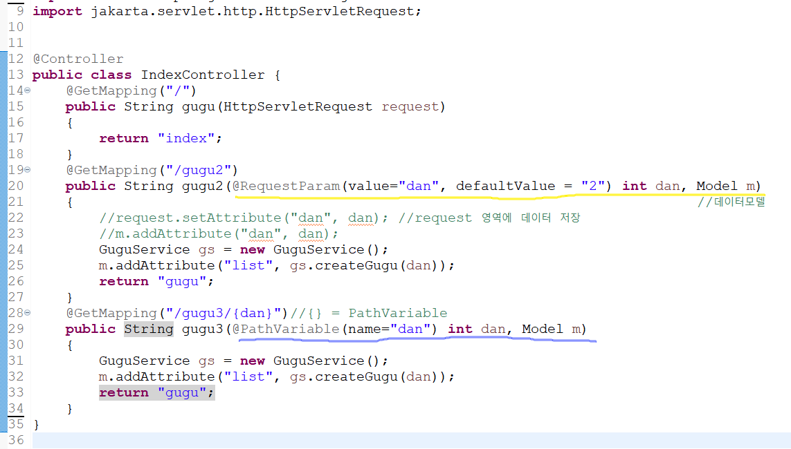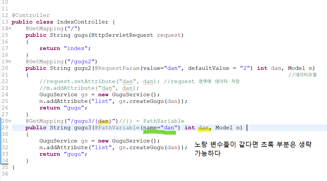 ๋ฐฉ๋ฒ3 : @PathVariable ( ํจ์ค ์ค์ ์ ํด์ค์ผํ๋ค. @GetMapping("/gugu/{dan}") )