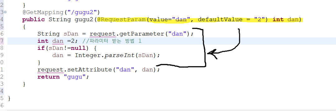 ๋ฐฉ๋ฒ 2 : @RequestParam(value="dan", defaltValue="2") (๋ํดํธ ๊ฐ์ ์ค ์ ์๋ค.)