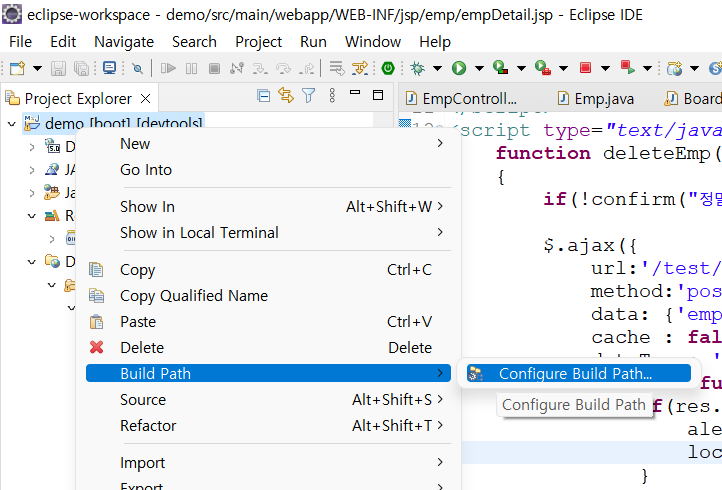 ๋จผ์ jdbc ๋ผ์ด๋ธ๋ฌ๋ฆฌ๋ฅผ ์ค์นํ๊ณ ์ถ์ ํ๋ก์ ํธ์ ์ฐํด๋ฆญํ์ฌ [Build Path] - [Configure Build Path]์ ๋ค์ด๊ฐ๋ค.