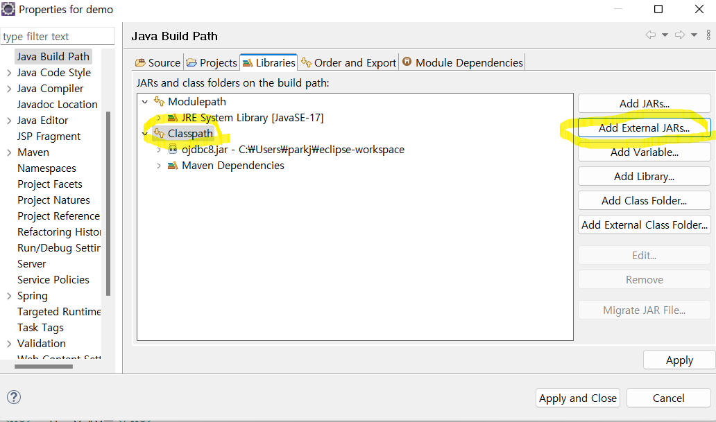 ๊ทธ๋ค์ Classpath๋ฅผ ์ ํํ๊ณ [Add External JARs] ๋๋ฌ ojdbc ํ์ผ์ด ๋ค์ด ์๋ ๊ฒฝ๋ก๋ฅผ ์ฐพ์์ ์ถ๊ฐํ ๋ค [Apply] [Apply and Close] ํด์ฃผ๋ฉด ๋๋ค.