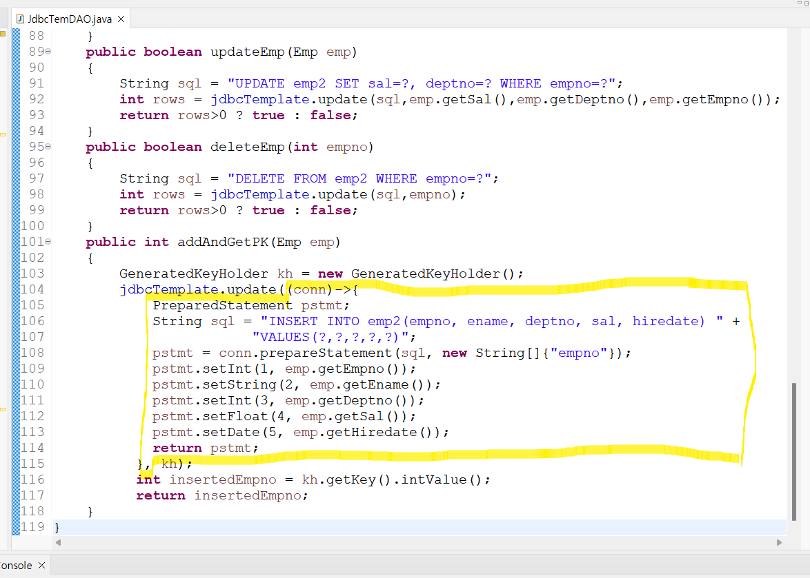 pstmt.setInt(3, emp.getDeptno());