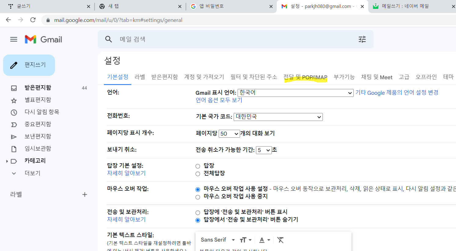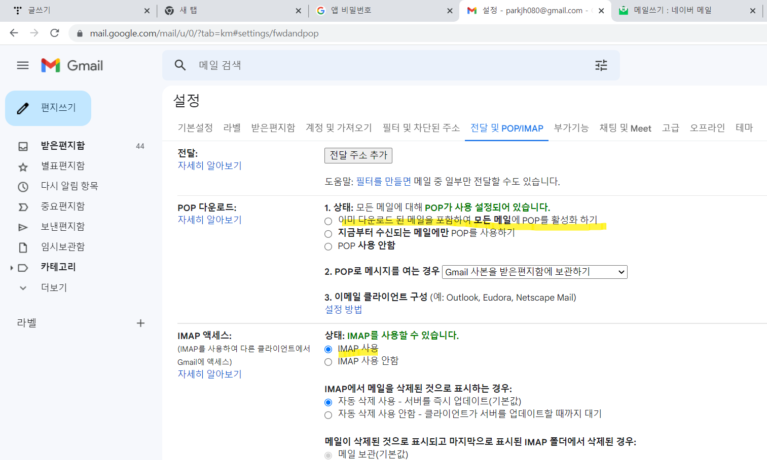 - Gmail๋ก ์ด๋ > ์ฐ์ธก ์๋จ ํฑ๋๋ฐํด > [๋ชจ๋ ์ค์ ๋ณด๊ธฐ] > ์ ๋ฌ ๋ฐ POP/IMAP >