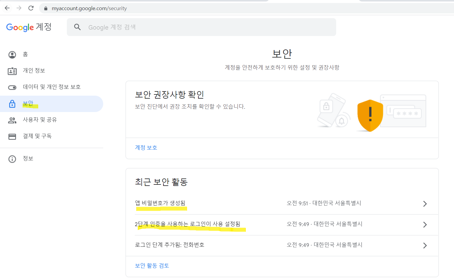 - Google ๋ก๊ทธ์ธ > ๋ธ๋ผ์ฐ์ ์ฐ์๋จ ํ๋กํ ์ด๋ฏธ์ง > ๊ณ์ ๊ด๋ฆฌ > ๋ณด์ >