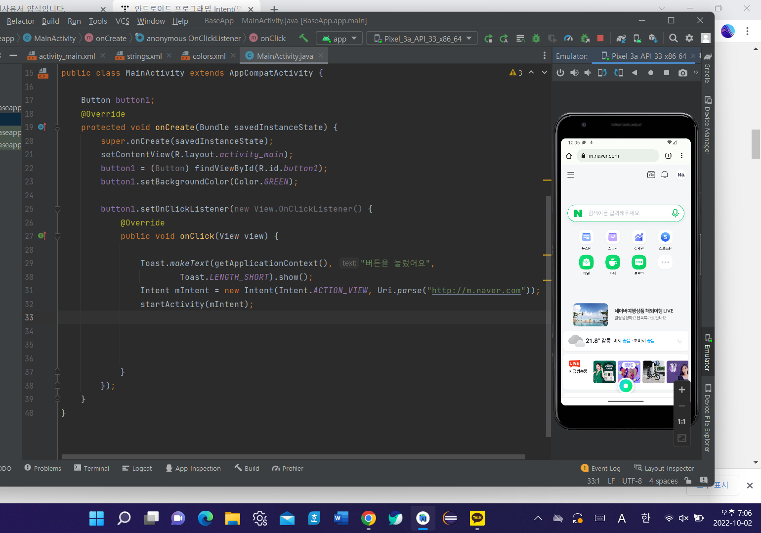 λ²νΌμ λλ μλ Intent.ACTION_VIEWλ₯Ό μ¬μ©νμ¬ "http://m.naver.com"μ μ μν μ μκ² νλ€.