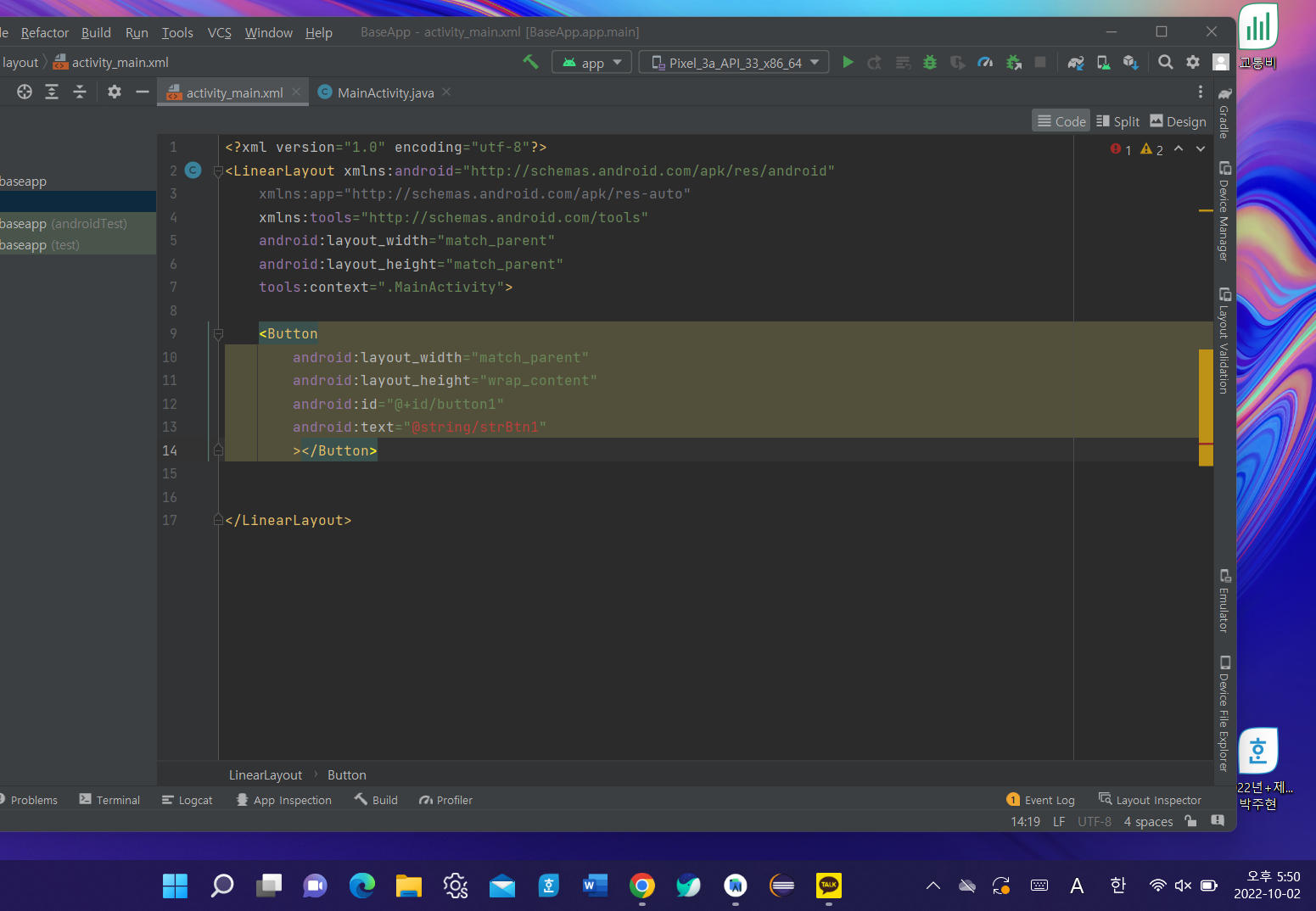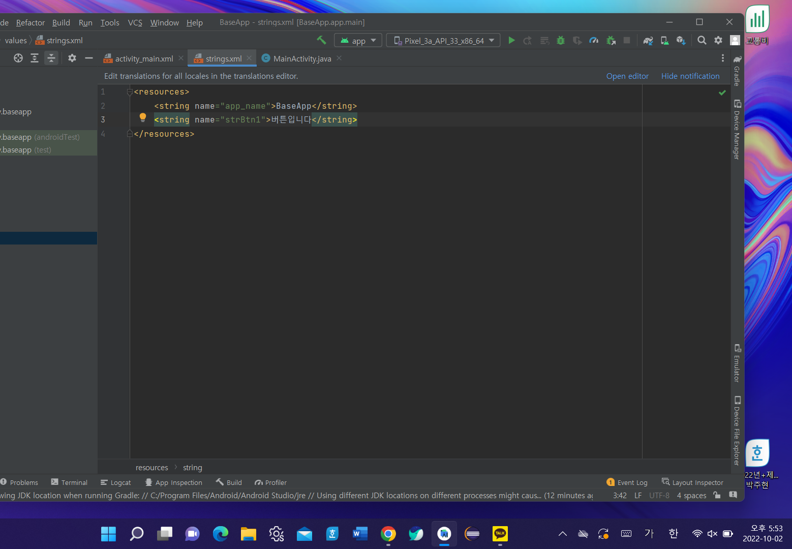 strBtn1μ μ€μ νκΈ° μν΄ [res] - [values] - [strings.xml] νμ λλ¬ strBtn1μ μμ±νκ³ λ΄μ©μ μ μ΄μ€λ€.